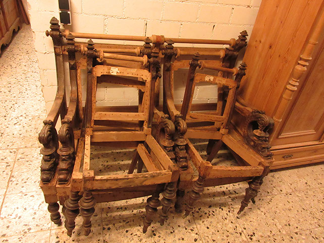 Nussbaum Sitzmöbel (Sofa, 2 Sessel, 3 Stühle), ca. 1870, unrestauriert (Detail)